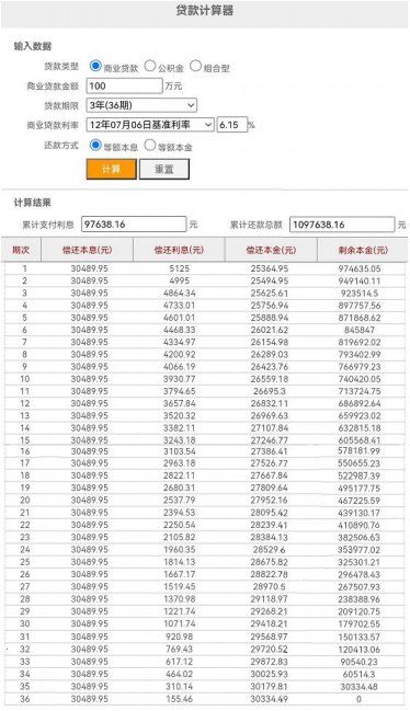 如下图(图片来自于网络)中,100万元贷款本金,3年期按月等额本息还款,年利率6.15%,折算民间惯称的月息为6.15%/12=0.51%,即5厘1;按小李的算法:总利息97638.16除以本金1000000,再除以3,得出年利率3.25%,再折算民间惯称的月息为3.25%/12=0.27%,即2厘7。
